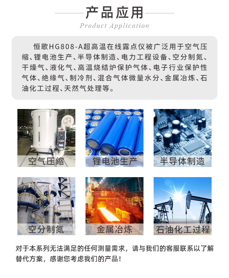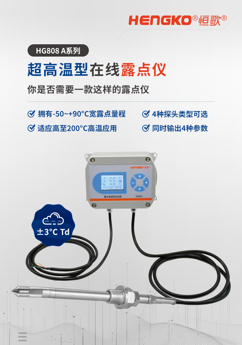 恒歌HG808-A系列在線露點變送器專為高溫干燥環境中的露點測量而設計,在高達160°C的溫度下擁有優秀的露點測量精度,即使在200℃的溫度下仍然能安全工作。此外,其在應對各類工業極端環境時,具有一定的抗干擾、耐腐蝕、防塵防污染的性能。也因此被客戶廣泛用于空氣壓縮、鋰電池生產、半導體制造、電力工程設備、空分制氮、電子行業保護性氣體等場景進行露點測量。