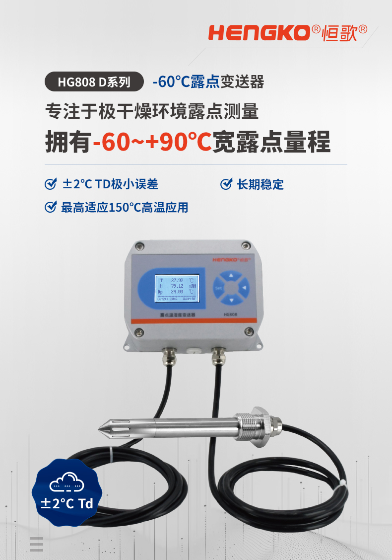 HG808-D系列在線露點測量儀結合了高品質濕敏元件和先進校準技術,非常適用于極干燥環境的露點測量,露點范圍涵蓋-60~90°℃,并且實現+2°℃ Td高精誤差。也正因變送器在干燥環境下對微水靈敏的感知能力,常被用于需要對環境濕度進行精確控制的場合,,例如鋰電池研究生產、半導體應用、壓縮空氣干燥設備出氣口、手套箱微水檢測等場景。