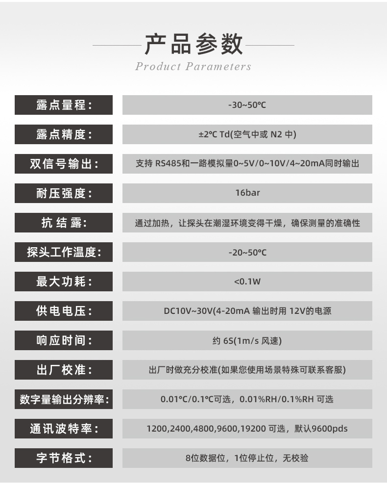 恒歌露點(diǎn)變送器采用瑞士 SENSIRION 進(jìn)口 SHT 系列溫濕度傳感器,可同時(shí)采集溫度及濕度數(shù)據(jù),具有精度高、功耗低、一致性好的特點(diǎn);采集到的溫濕度信號(hào)數(shù)據(jù),同時(shí)計(jì)算露點(diǎn)、濕球數(shù)據(jù),可通過 RS485 接口輸出。11999
